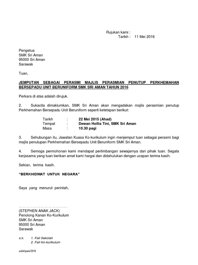 Bertemu lagi dengan saya husnul. Saya menguasai bahasa inggris, baik secara lisan maupun tulisan. Setiap orang yang membutuhkan informasi tentang acara atau kegiatan yang hendak dilaksanakan tentu sebelumnya perlu pemberitahuan lebih dulu agar memperoleh penjelasan secara detail, tentang tema acara, waktu. Hingga saat ini, mayoritas perusahaan masih banyak menggunakan surat sebagai media komunikasi dengan perusahaan lain. Sehubungan dengan diselenggarakannya acara peresmian perusahaan, maka bersama dengan surat ini kami mengundang seluruh manager pt. Sekolah kebangsaan bukit rahmatkampung bukit rahmat,84700, gersik, tangkak, tel : Kita akan lanjutkan pembahasan dengan mengenal beberap contoh surat undangan tidak resmi. Nomor surat yang dikeluarkan harus sesuai dengan urutan surat, dihitung mulai dari nomor akhir pembuatan surat. Rasmi dan memo rasmi dari semasa ke semasa sama ada dengan menghadiri program latihan seperti kursus bengkel. Jika perusahaan anda membutuhkan beberapa barang yang hendak dibutuhkan, maka tentu anda harus. Surat jemputan ceramah dan pameran anti dadah. Biasanya surat ini dilengkapi dengan materai sebagai penguat kepercayaan dan agar terlihat kredibel. Atau masih kesulitan nulisnya gimana?