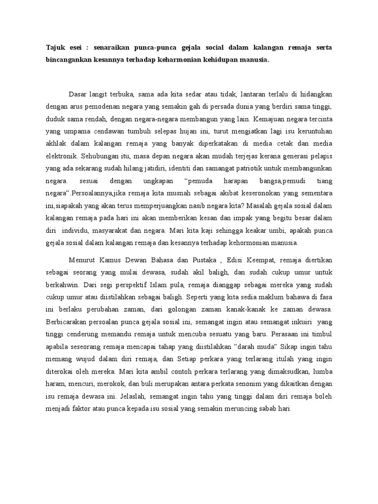 Related : Gejala Sosial Dalam Kalangan Remaja Karangan : Dalam surat khabar sering dipaparkan berita tentang golongan remaja yang terlibat dengan gejala sosial ini..